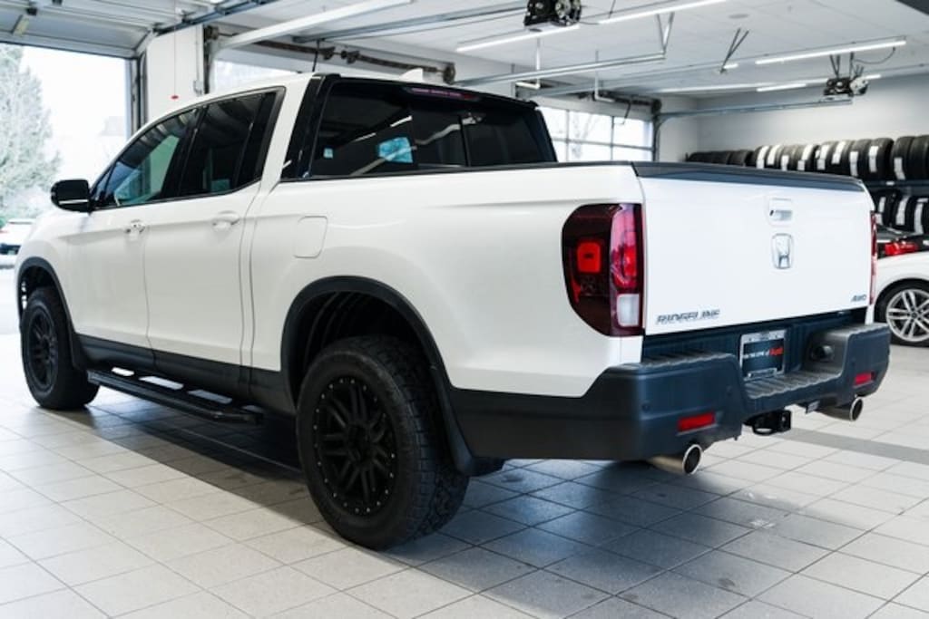 Exterior features include 18-inch black alloy wheels, LED headlights, fog lights, black running boards, and roof rails, giving the Ridgeline a sporty and practical appearance. The power tailgate and towing package make it versatile for both work and recreation.