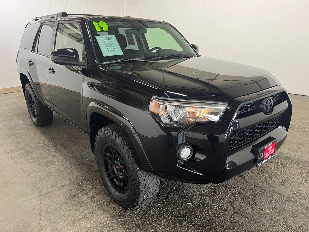 4WD, 3.727 Axle Ratio, 4-Wheel Disc Brakes, ABS brakes, Air Conditioning, Alloy wheels, AM/FM radio: SiriusXM, Anti-whiplash front head restraints, Brake assist, Bumpers: body-color, CD player, Driver door bin, Driver vanity mirror, Dual front impact airbags, Dual front side impact airbags, Electronic Stability Control, Emergency communication system: Safety Connect, Exterior Parking Camera Rear, Front anti-roll bar, Front Bucket Seats, Front Center Armrest, Front fog lights, Front reading lights, Front wheel independent suspension, Heated door mirrors, Illuminated entry, Knee airbag, Low tire pressure warning, Occupant sensing airbag, Outside temperature display, Overhead airbag, Overhead console, Panic alarm, Passenger door bin, Passenger vanity mirror, Power door mirrors, Power driver seat, Power steering, Power windows, Rear anti-roll bar, Rear seat center armrest, Rear window defroster, Rear window wiper, Remote keyless entry, Security system, Speed control, Speed-sensing steering, Split folding rear seat, Spoiler, Steering wheel mounted audio controls, Tachometer, Telescoping steering wheel, Tilt steering wheel, Traction control, Trip computer, Variably intermittent wipers, 4WD. Priced below KBB Fair Purchase Price! Features: 2019 Toyota 4Runner Black 4WD 4.0L V6 SMPI DOHC 5-Speed Automatic with Overdrive
