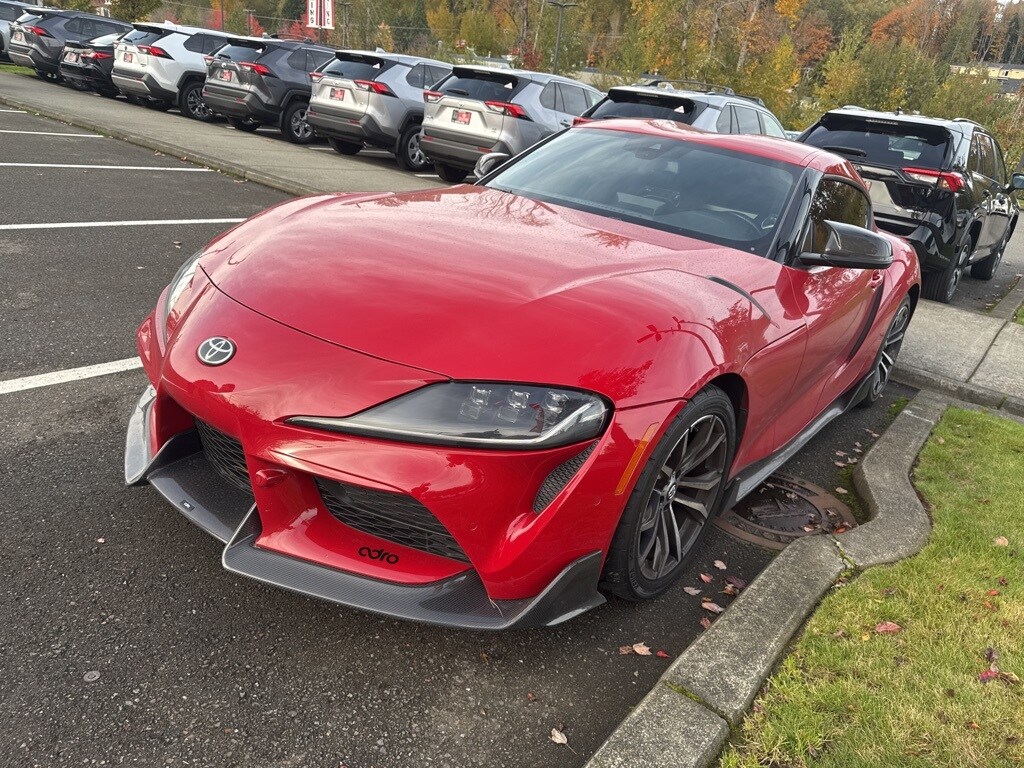 4 Speakers, 4-Wheel Disc Brakes, ABS brakes, Adaptive Cruise Control w/Stop & Go, Air Conditioning, Alcantara/Leather Seat Trim, Alloy Wheel Locks (TMS), Alloy wheels, AM/FM radio: SiriusXM, AM/FM Stereo w/4 Speakers, Auto High-beam Headlights, Auto-dimming door mirrors, Auto-dimming Rear-View mirror, Automatic temperature control, Brake assist, Bumpers: body-color, Carpet Cargo Mat (TMS), Child-Seat-Sensing Airbag, Clearance & Back Up Sonar, Delay-off headlights, Driver door bin, Driver vanity mirror, Driving Assistant Safety Sense, Dual front impact airbags, Dual front side impact airbags, Electronic Stability Control, Emergency Assistance Kit (TMS), Exterior Parking Camera Rear, First Aid Kit (TMS), Four wheel independent suspension, Front anti-roll bar, Front Bucket Seats, Front Center Armrest, Front dual zone A/C, Front fog lights, Front reading lights, Front Sport Seats, Fully automatic headlights, Garage door transmitter: HomeLink, Heated door mirrors, Illuminated entry, Knee airbag, Leather Shift Knob, Leather steering wheel, Low tire pressure warning, Occupant sensing airbag, Outside temperature display, Overhead airbag, Panic alarm, Passenger door bin, Passenger vanity mirror, Power door mirrors, Power driver seat, Power passenger seat, Power steering, Power windows, Radio data system, Radio: 500-Watt AM/FM JBL Audio w/12 Speakers, Rain sensing wipers, Rear anti-roll bar, Rear window defroster, Remote keyless entry, Safety & Technology Package, Security system, Speed control, Speed-sensing steering, Speed-Sensitive Wipers, Steering wheel mounted audio controls, Tachometer, Telescoping steering wheel, Tilt steering wheel, Traction control, Trip computer, Turn signal indicator mirrors, Variably intermittent wipers, Wheels: 18" Cast Aluminum. Priced below KBB Fair Purchase Price! Features: 2021 Toyota Supra 2.0 Red RWD 2.0L Turbocharged 8-Speed Automatic