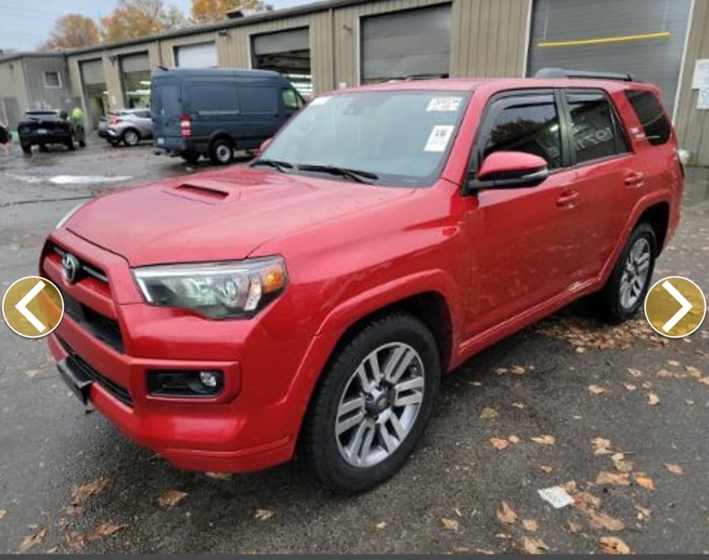 Graphite Artificial Leather, 3.727 Axle Ratio, 4-Wheel Disc Brakes, 8 Speakers, ABS brakes, Air Conditioning, Alloy wheels, AM/FM radio: SiriusXM, Anti-whiplash front head restraints, Apple CarPlay/Android Auto, Auto High-beam Headlights, Black Roof Rails, Brake assist, Bumpers: body-color, Driver door bin, Driver vanity mirror, Dual front impact airbags, Dual front side impact airbags, Electronic Stability Control, Emergency communication system: Safety Connect (1-year trial), Exterior Parking Camera Rear, Front anti-roll bar, Front Bucket Seats, Front Center Armrest, Front fog lights, Front reading lights, Front wheel independent suspension, Garage Door Opener, Heated door mirrors, Heated Outside Rear-View Mirrors, Illuminated entry, Knee airbag, Leather Shift Knob, Leather steering wheel, Low tire pressure warning, Occupant sensing airbag, Outside temperature display, Overhead airbag, Overhead console, Panic alarm, Panoramic Back Monitor, Passenger door bin, Passenger vanity mirror, Power door mirrors, Power driver seat, Power steering, Power windows, Radio: Audio, Rear anti-roll bar, Rear seat center armrest, Rear window defroster, Rear window wiper, Remote keyless entry, Roof rack: rails only, Security system, Shift Knob, Sliding Rear Cargo Deck, SofTex Seat Trim, Speed control, Speed-sensing steering, Split folding rear seat, Spoiler, Steering wheel mounted audio controls, Tachometer, Technology Package, Telescoping steering wheel, Tilt steering wheel, Traction control, TRD Sport Badge, TRD Sport Carpet Floor Mats, TRD Sport Package, Trip computer, Trunk Carpet, Variably intermittent wipers, Wheels: 20" Unique Dual 6-Spoke Alloy, Graphite Artificial Leather. Features: 2023 Toyota 4Runner TRD Sport Barcelona Red Metallic RWD 4.0L V6 DOHC 24V 5-Speed with ECT
