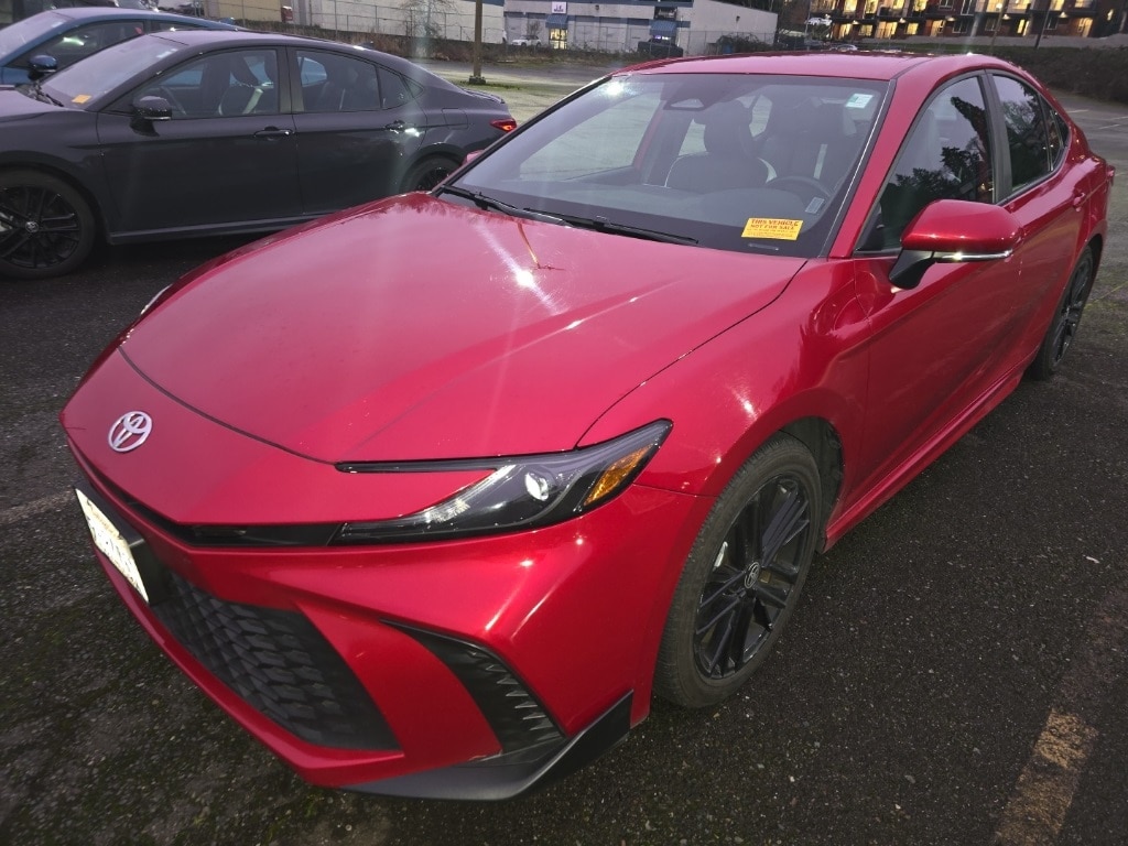 2.5L 4-Cylinder 16V DOHC, Black Cloth, 4-Wheel Disc Brakes, 6 Speakers, ABS brakes, Air Conditioning, Alloy wheels, AM/FM radio: SiriusXM, Apple CarPlay/Android Auto, Auto High-beam Headlights, Automatic temperature control, Brake assist, Bumpers: body-color, Delay-off headlights, Driver door bin, Driver vanity mirror, Dual front impact airbags, Dual front side impact airbags, Electronic Stability Control, Emergency communication system: Safety Connect (up to 10-year trial subscription), Exterior Parking Camera Rear, Four wheel independent suspension, Front anti-roll bar, Front Bucket Seats, Front Center Armrest, Front dual zone A/C, Front reading lights, Fully automatic headlights, Heated door mirrors, Illuminated entry, Knee airbag, Leather Shift Knob, Leather steering wheel, Low tire pressure warning, Occupant sensing airbag, Outside temperature display, Overhead airbag, Overhead console, Panic alarm, Passenger door bin, Passenger vanity mirror, Power door mirrors, Power driver seat, Power steering, Power windows, Radio data system, Radio: Toyota Audio Multimedia w/12.3" Touchscreen, Radio: Toyota Audio Multimedia w/8" Touchscreen, Rear anti-roll bar, Rear reading lights, Rear seat center armrest, Rear side impact airbag, Rear window defroster, Remote keyless entry, Security system, SofTex & Fabric Seat Trim, Speed control, Speed-sensing steering, Split folding rear seat, Spoiler, Steering wheel mounted audio controls, Telescoping steering wheel, Tilt steering wheel, Traction control, Trip computer, Turn signal indicator mirrors, Variably intermittent wipers, Wheels: 18" Black-Finished Alloy, 2.5L 4-Cylinder 16V DOHC, Black Cloth. Features: 2025 Toyota Camry SE Red FWD 2.5L 4-Cylinder 16V DOHC eCVT