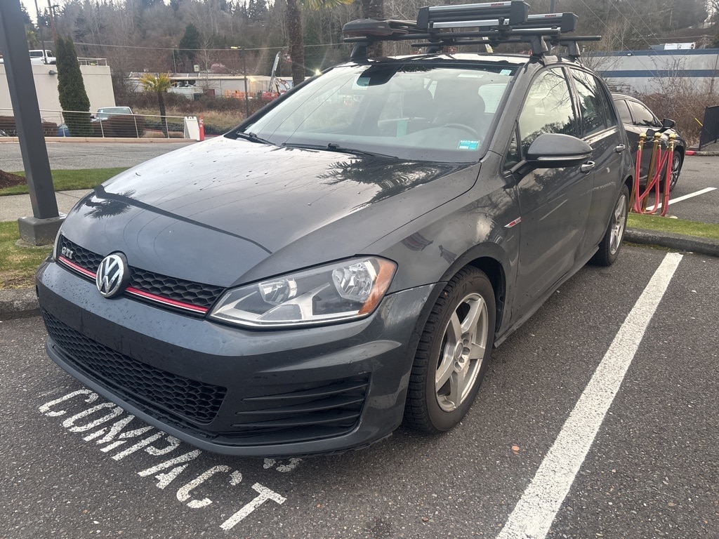 4-Wheel Disc Brakes, 8 Speakers, ABS brakes, Air Conditioning, Alloy wheels, AM/FM radio: SiriusXM, Anti-whiplash front head restraints, Brake assist, Bumpers: body-color, CD player, Cloth Seating Surfaces, Compass, Driver door bin, Driver vanity mirror, Dual front impact airbags, Dual front side impact airbags, Electronic Stability Control, Emergency communication system: VW Car-Net, Exterior Parking Camera Rear, Four wheel independent suspension, Front anti-roll bar, Front Bucket Seats, Front Center Armrest, Front fog lights, Front reading lights, Heated door mirrors, Heated front seats, Heated Top Sport Front Seats, Illuminated entry, Leather Shift Knob, Leather steering wheel, Low tire pressure warning, Occupant sensing airbag, Outside temperature display, Overhead airbag, Overhead console, Panic alarm, Passenger door bin, Passenger vanity mirror, Power door mirrors, Power driver seat, Power passenger seat, Power steering, Power windows, Radio data system, Radio: Composition Media w/6.5" Touchscreen, Rear anti-roll bar, Rear reading lights, Rear seat center armrest, Rear window defroster, Rear window wiper, Remote keyless entry, Security system, Speed control, Speed-sensing steering, Split folding rear seat, Spoiler, Sport steering wheel, Steering wheel mounted audio controls, Tachometer, Telescoping steering wheel, Tilt steering wheel, Traction control, Trip computer, Turn signal indicator mirrors, Variably intermittent wipers, Wheels: 18" Austin Alloy. Features: 2017 Volkswagen Golf GTI S Gray FWD 2.0L TSI 6-Speed Manual