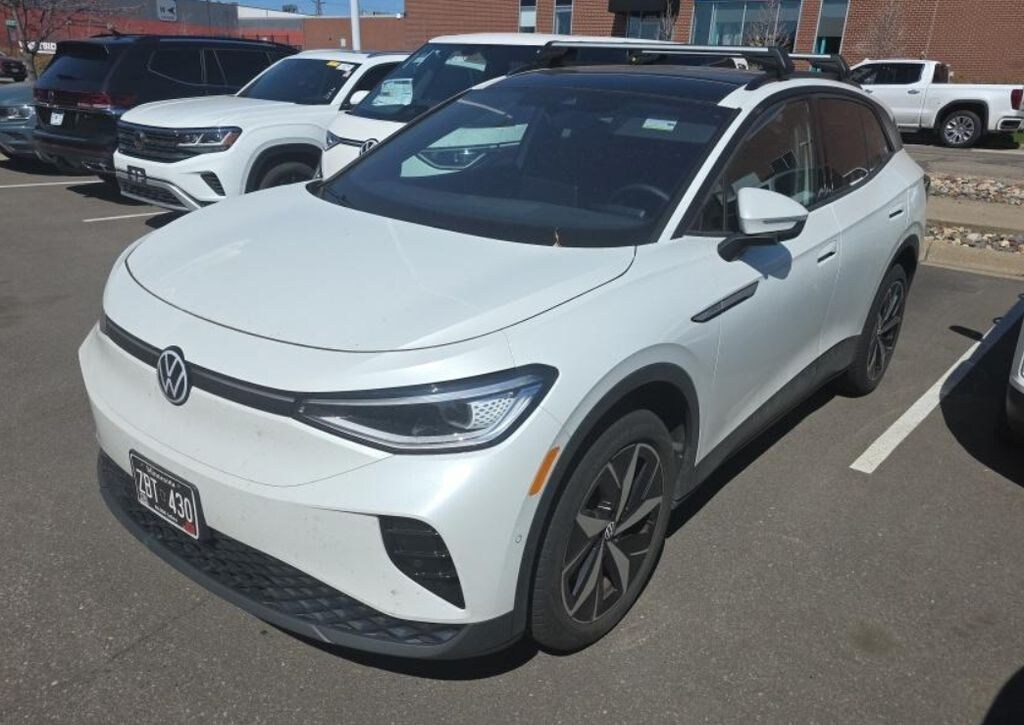 2023 Volkswagen ID.4 Pro S Opal White AWD Electric Motor Single-Speed Automatic Showroom Sales Open!!, 3.90 Axle Ratio, 4 Wheel Independent Suspension, 7 Speakers, ABS brakes, Air Conditioning, Alloy wheels, Auto High-beam Headlights, Auto-dimming Rear-View mirror, Automatic temperature control, Brake assist, Bumpers: body-color, Delay-off headlights, Driver door bin, Driver vanity mirror, Driver's Seat Mounted Armrest, Dual front impact airbags, Dual front side impact airbags, Electronic Stability Control, Emergency communication system: VW Car-Net Safe & Secure 5-year, Exterior Parking Camera Rear, Four wheel independent suspension, Front anti-roll bar, Front Bucket Seats, Front dual zone A/C, Front fog lights, Front reading lights, Fully automatic headlights, Heated door mirrors, Heated Front Seats, Heated front seats, Heated steering wheel, Illuminated entry, Low tire pressure warning, Memory seat, Navigation System, Occupant sensing airbag, Outside temperature display, Overhead airbag, Overhead console, Panic alarm, Passenger door bin, Passenger seat mounted armrest, Passenger vanity mirror, Perforated V-Tex Leatherette Seating Surfaces, Power door mirrors, Power driver seat, Power Liftgate, Power passenger seat, Power steering, Power windows, Radio data system, Radio: Discover Pro Max w/12" Touchscreen Nav, Rain sensing wipers, Rear anti-roll bar, Rear reading lights, Rear seat center armrest, Rear window defroster, Rear window wiper, Remote keyless entry, Speed control, Speed-sensing steering, Split folding rear seat, Spoiler, Steering wheel mounted audio controls, Telescoping steering wheel, Tilt steering wheel, Traction control, Trip computer, Turn signal indicator mirrors, Variably intermittent wipers, VW Car-Net Safe & Secure 5-Year Plan, VW Care, Wheels: 20" 5-Spoke 2-Tone Machined Alloy.